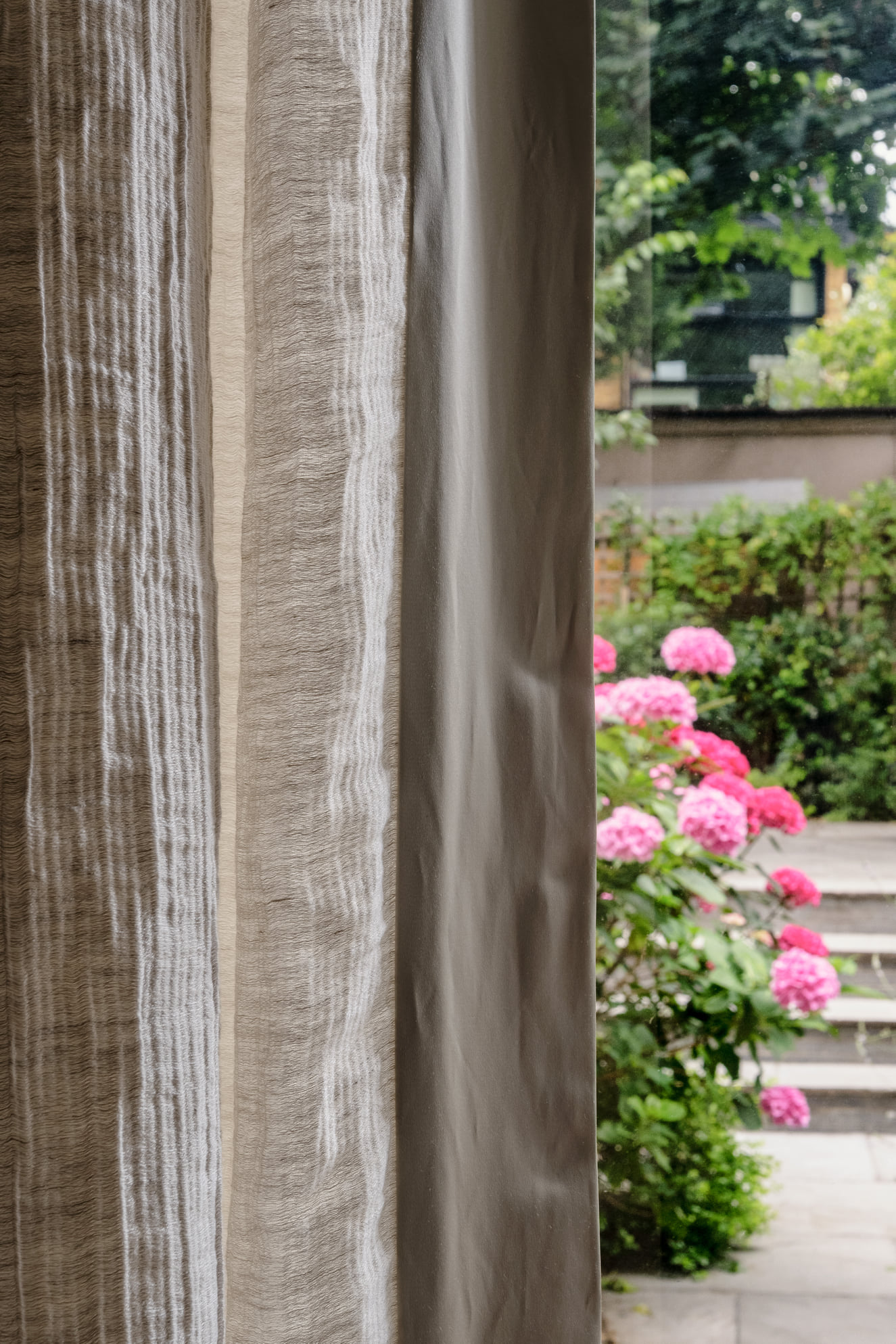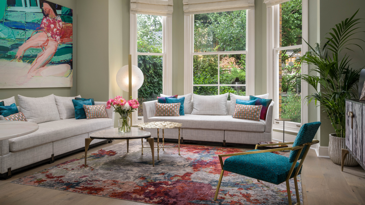 To highlight the proportions of the room and wonderful views of the garden beyond, the sofa has simple lines and upholstery. Interest is added through the pops of colour, shapes and materials of the pieces in the room, including marble and brass detailing to the minimalist furniture.