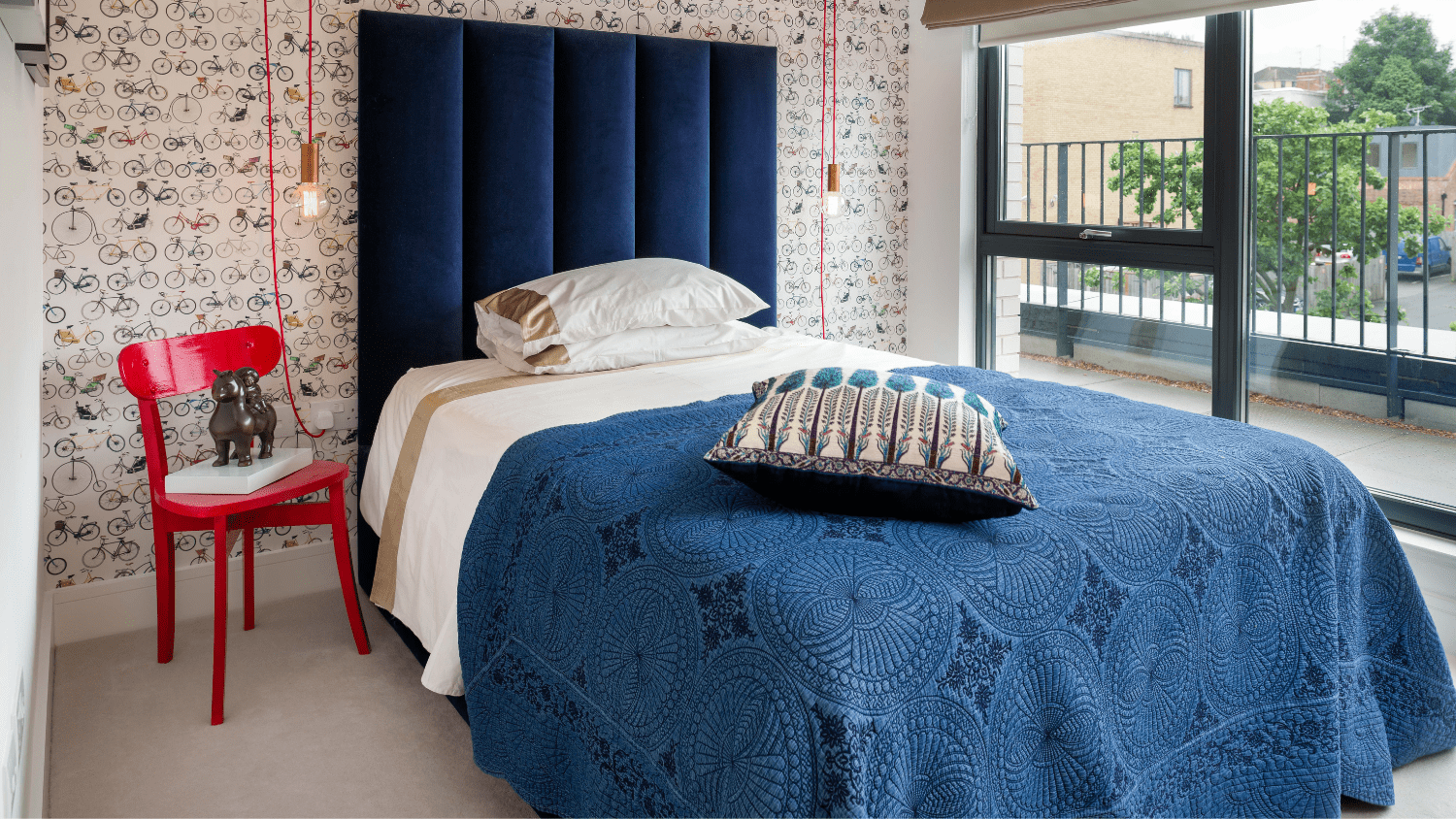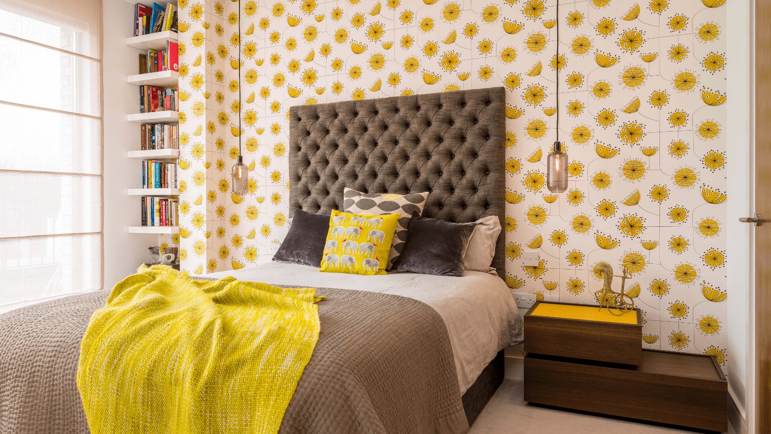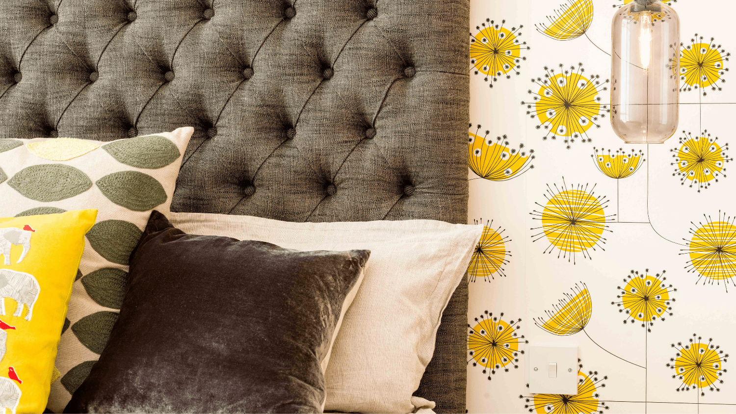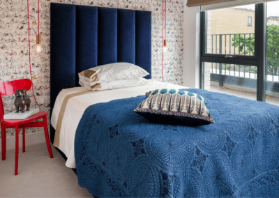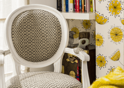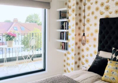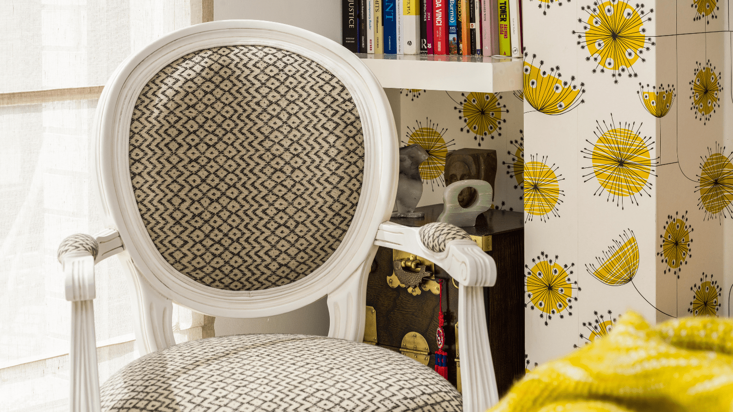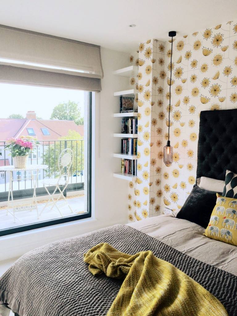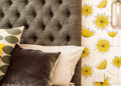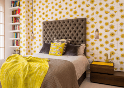 The bedroom with its opulent upholstered headboard is a sun filled haven – through the large French windows and the yellow fun wallpaper. The textures, patterns and pops of color creates a warm and inviting ambiance, reflecting the couple’s unique tastes and personalities.