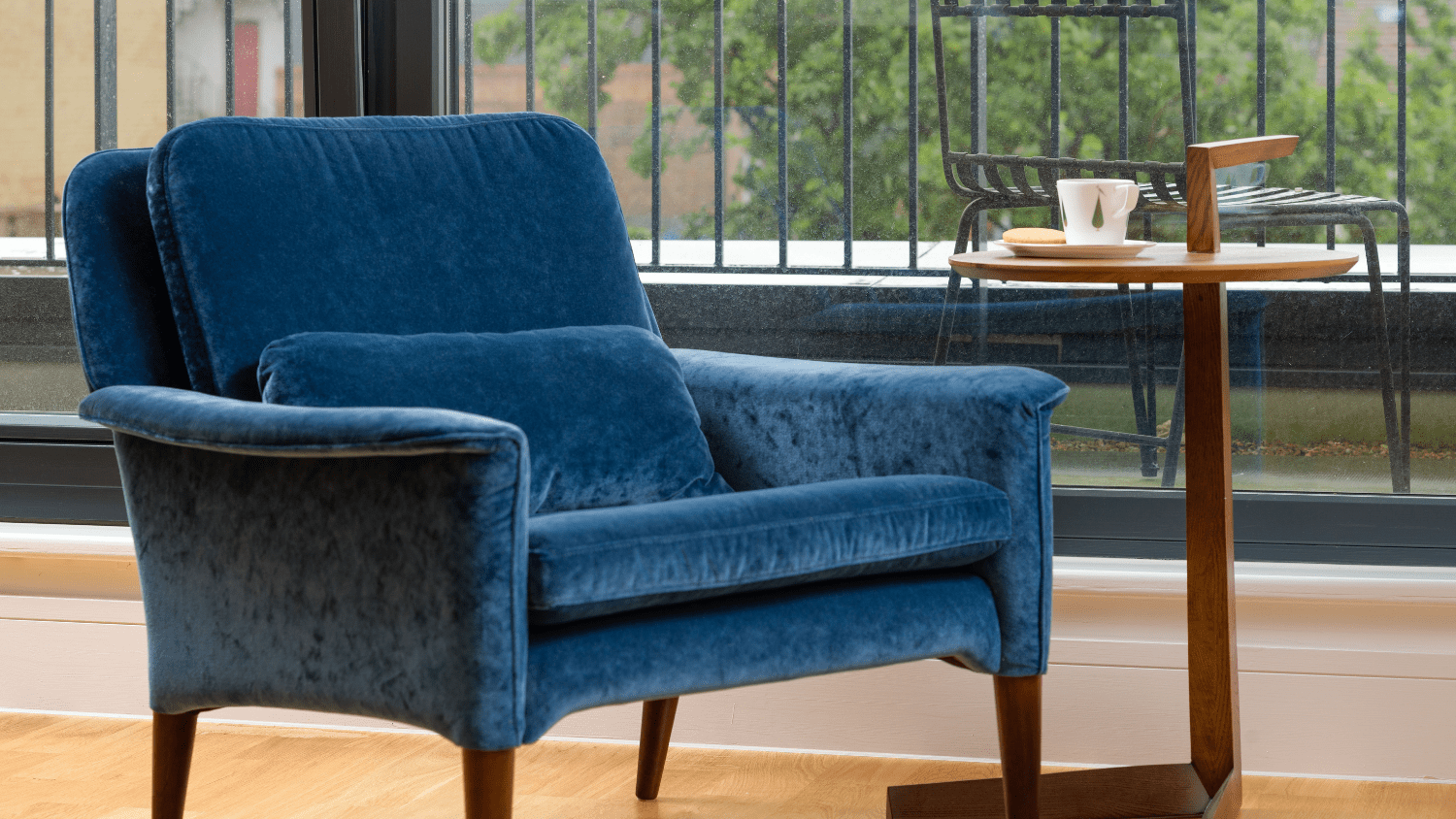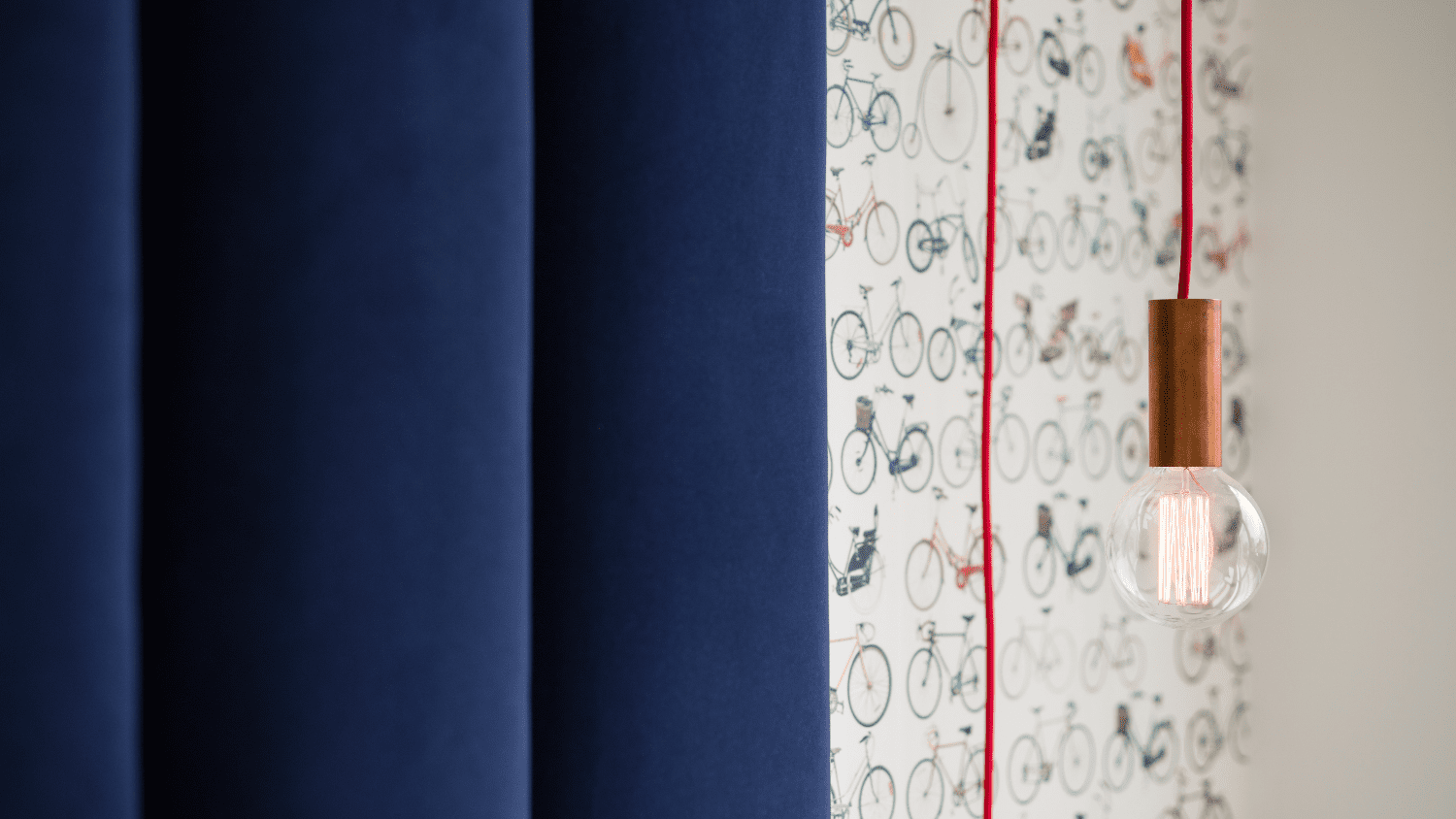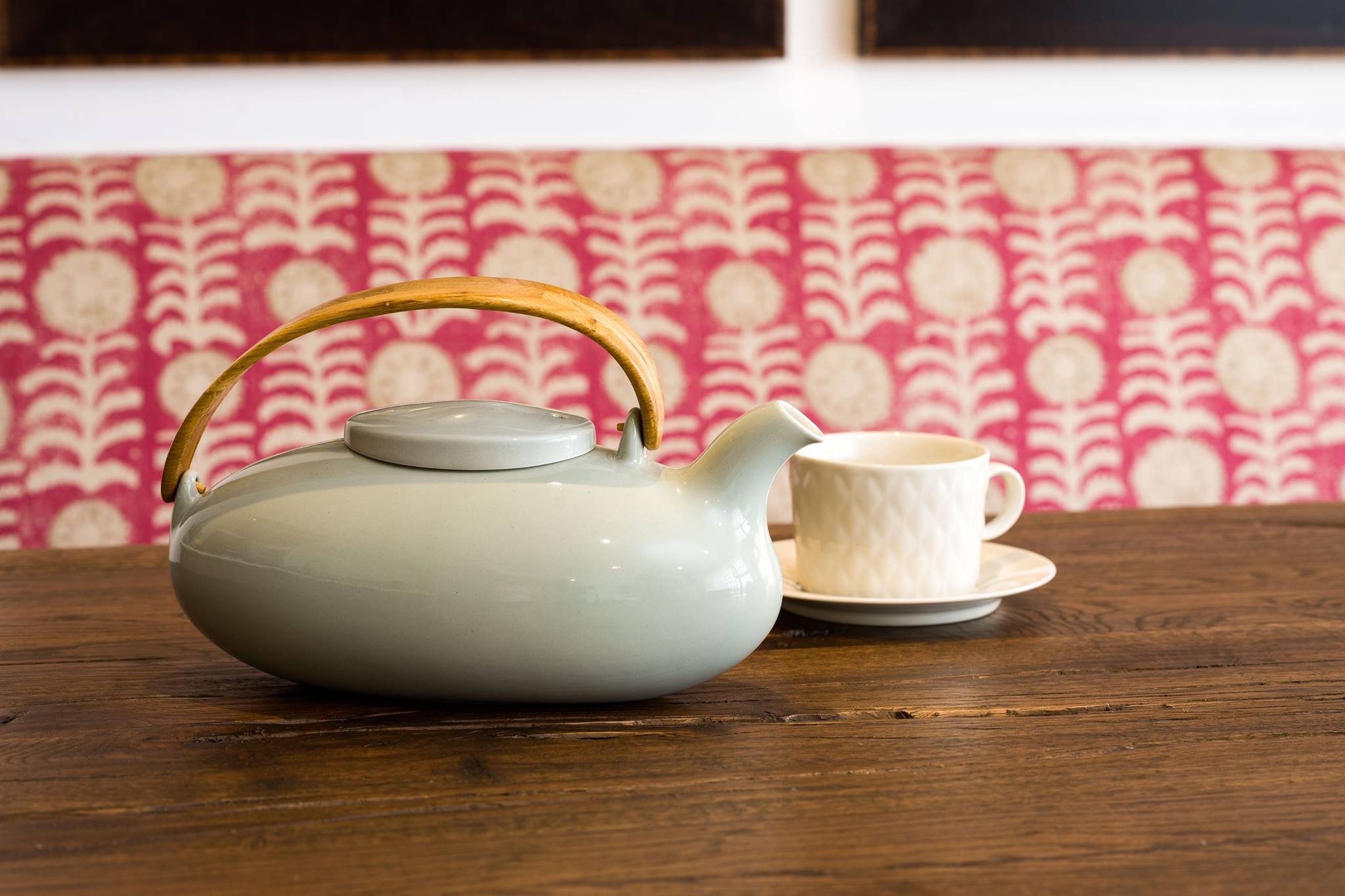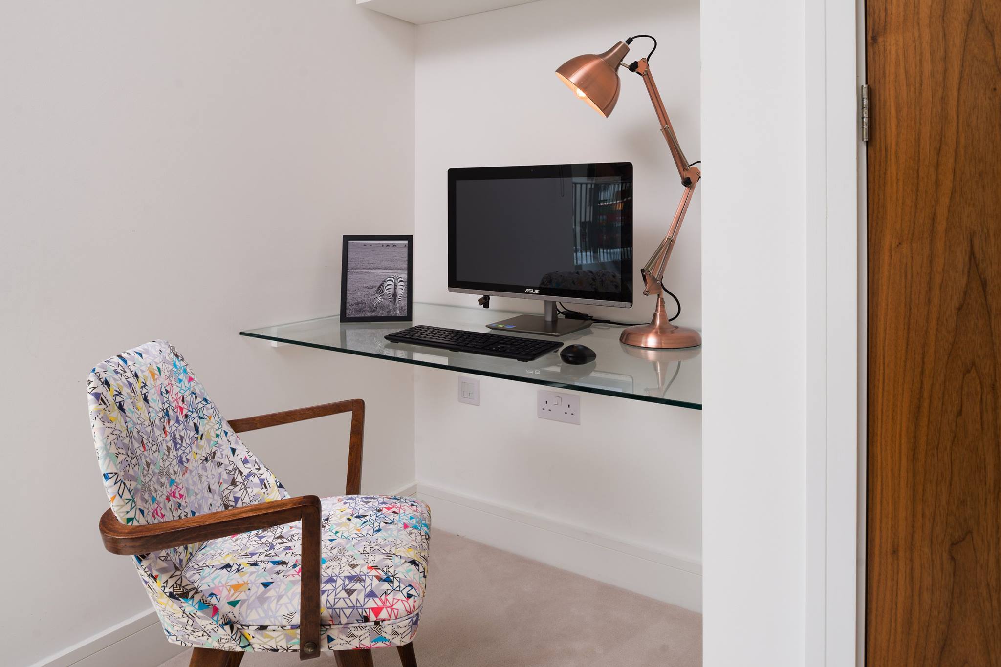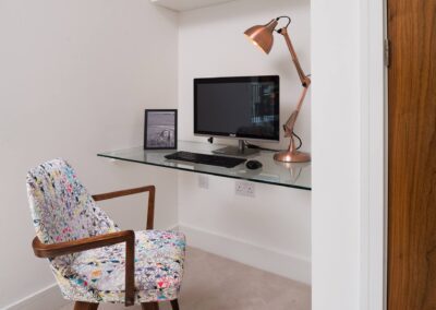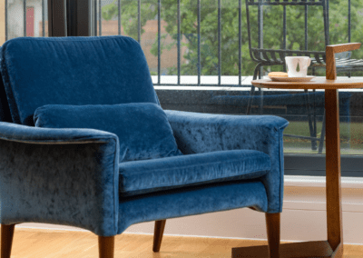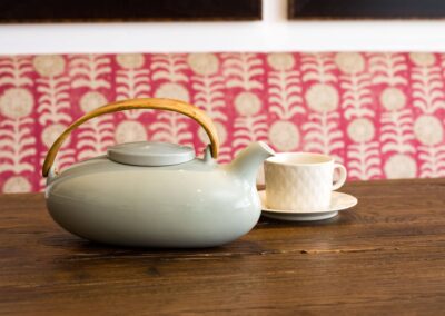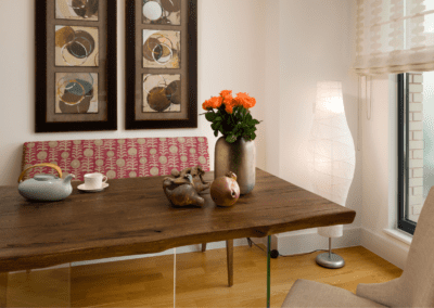 The bedroom with its opulent upholstered headboard is a sun filled haven – through the large French windows and the yellow fun wallpaper. The textures, patterns and pops of color creates a warm and inviting ambiance, reflecting the couple’s unique tastes and personalities.
