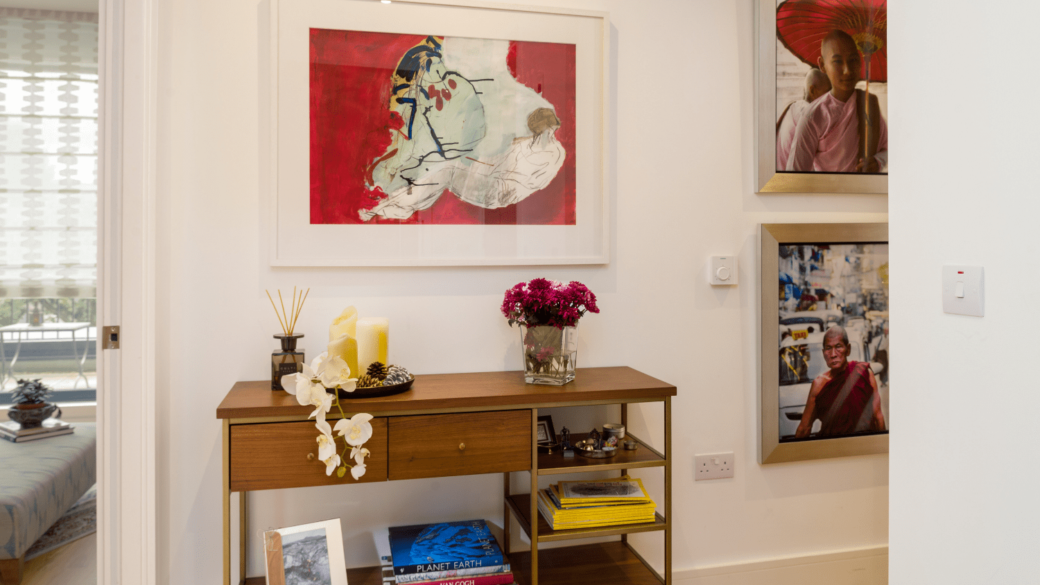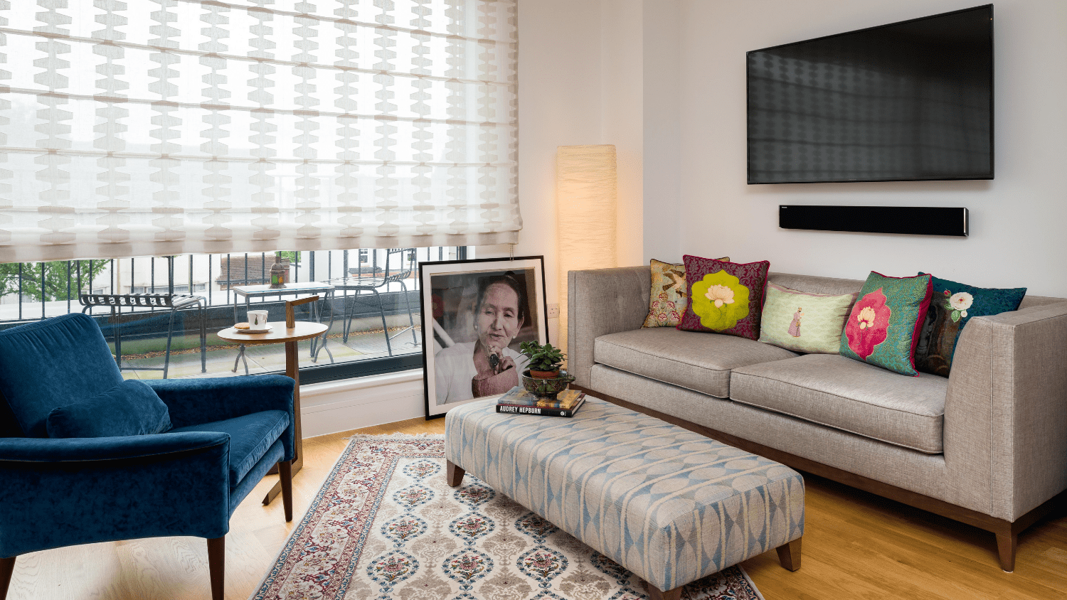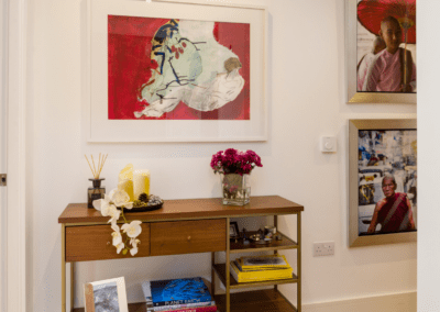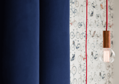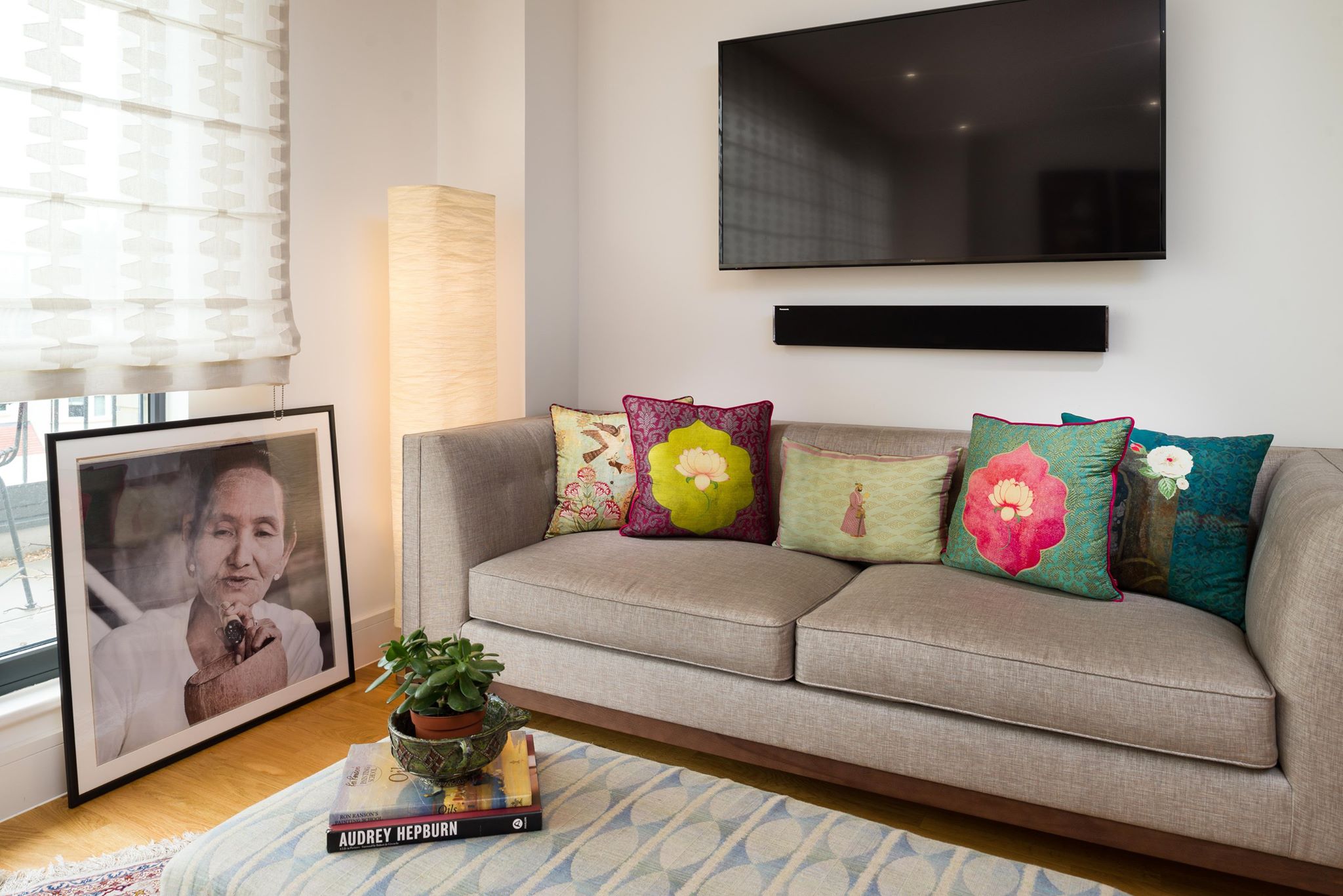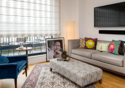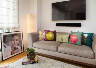 We designed this vibrant and cozy home for a for a young couple first home, It exudes modern elegance with playful charm… Textured wallpaper, pops of color add depth and character to the open-concept living area, featuring a grey linen sofa adorned with vibrant throw pillows and artful decor.