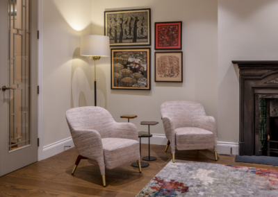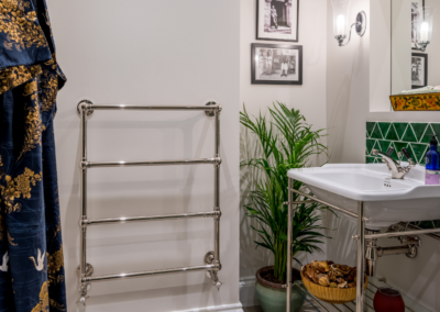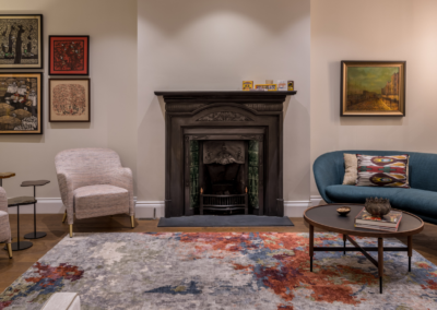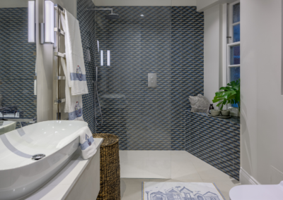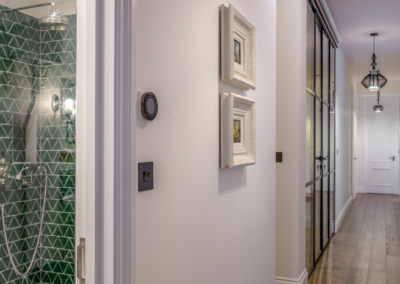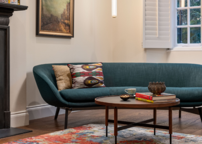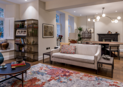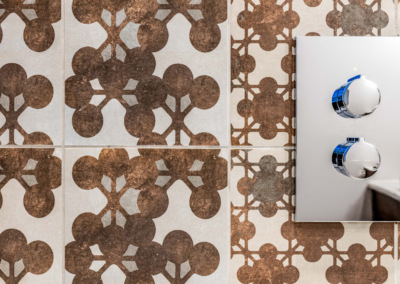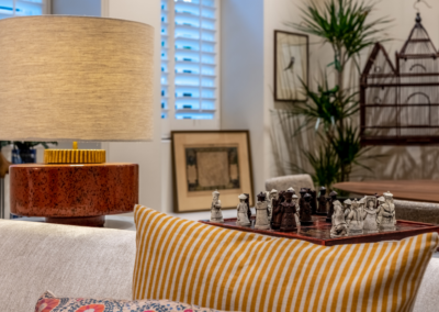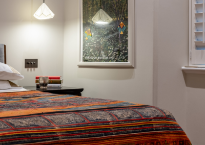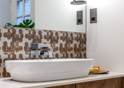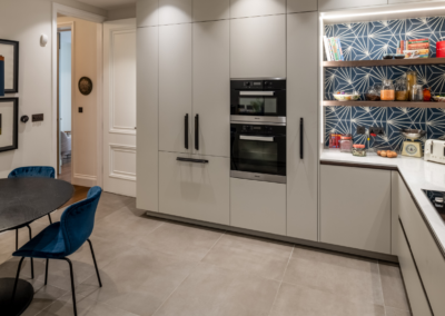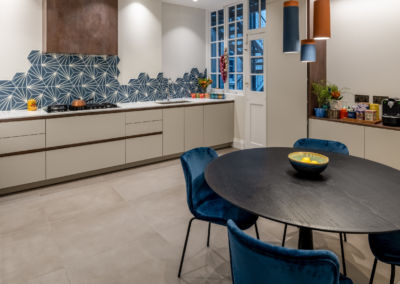 This captivating design effortlessly merges contrasting elements and vibrant shades, creating unique and inviting spaces throughout the home. The previously dark kitchen now feels light and airy with the use of pale colors, and randomly arranged cement tiles for the splashback add visual interest. High ceilings and ample windows enhance the sense of spaciousness.