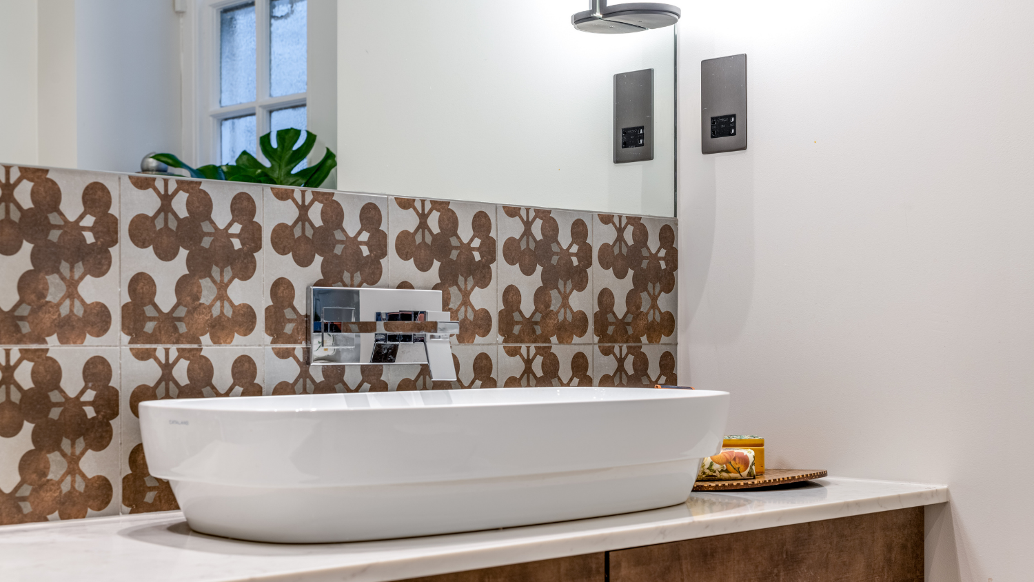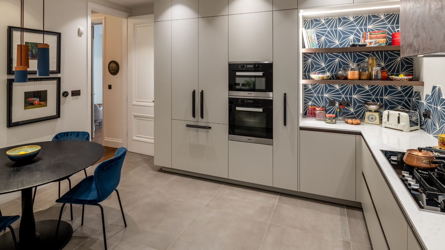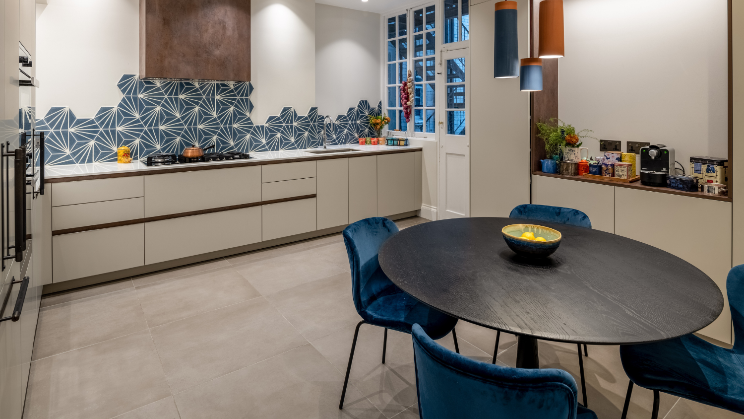 This captivating design effortlessly merges contrasting elements and vibrant shades, creating unique and inviting spaces throughout the home. The previously dark kitchen now feels light and airy with the use of pale colors, and randomly arranged cement tiles for the splashback add visual interest. High ceilings and ample windows enhance the sense of spaciousness.