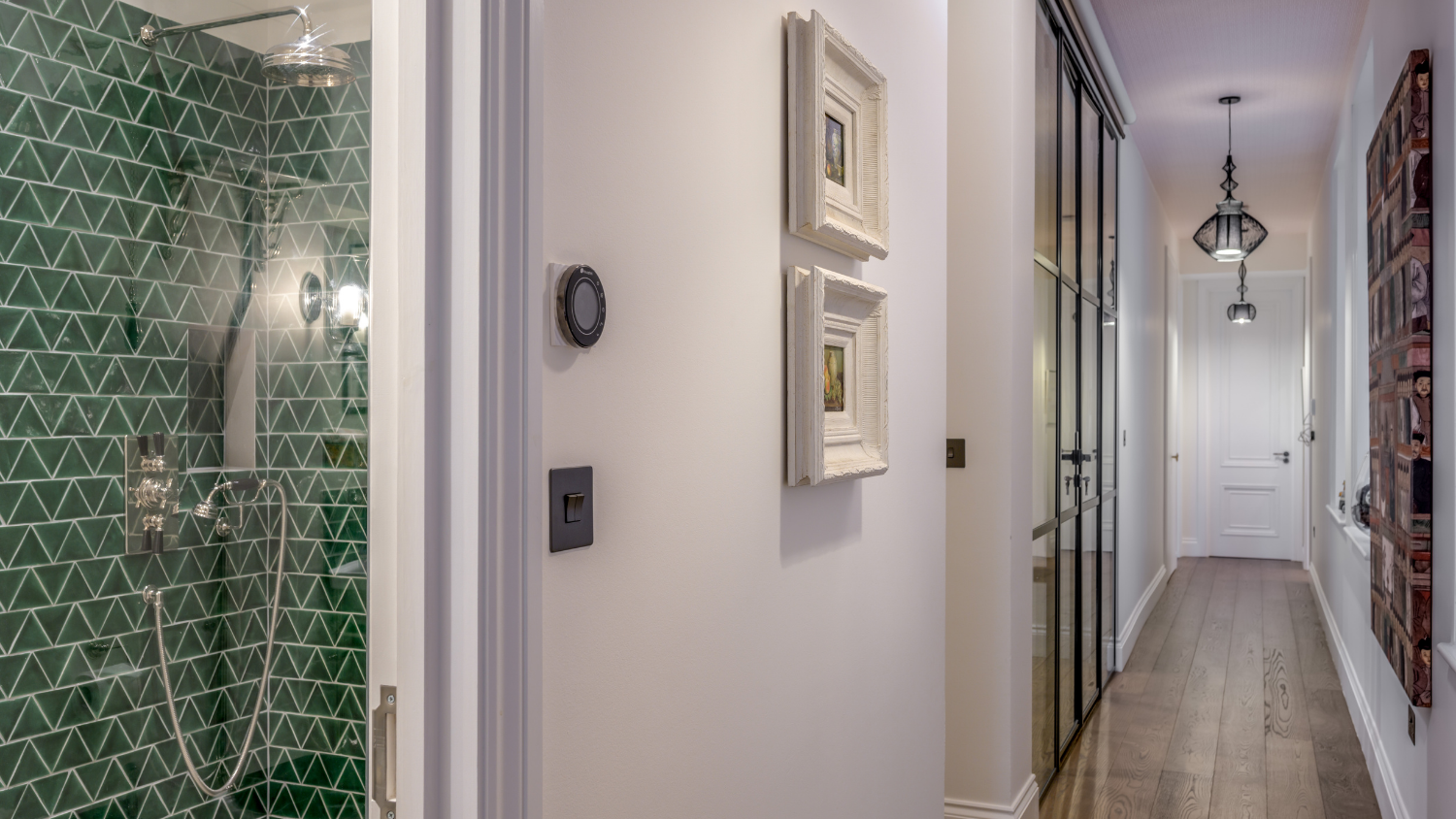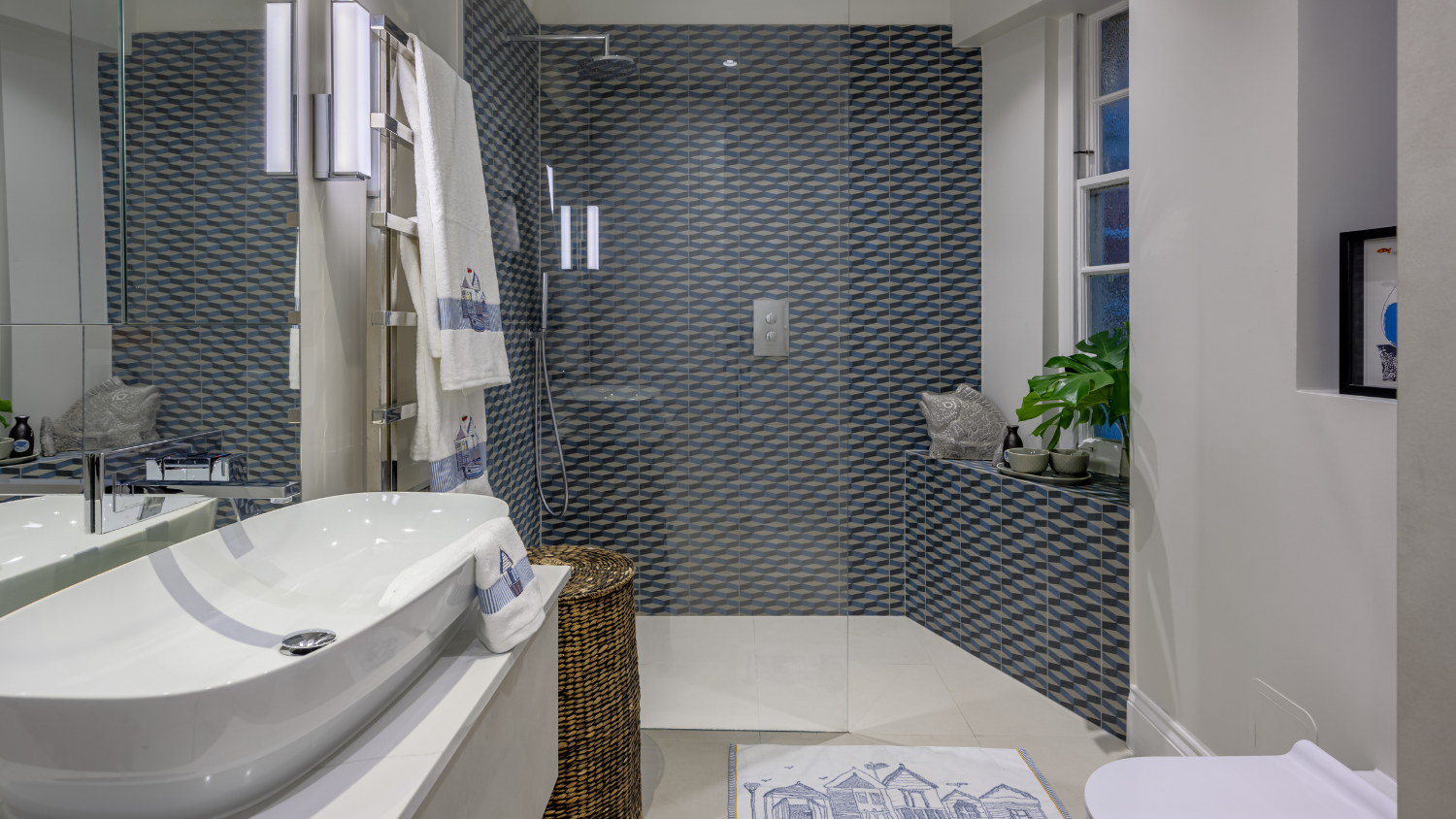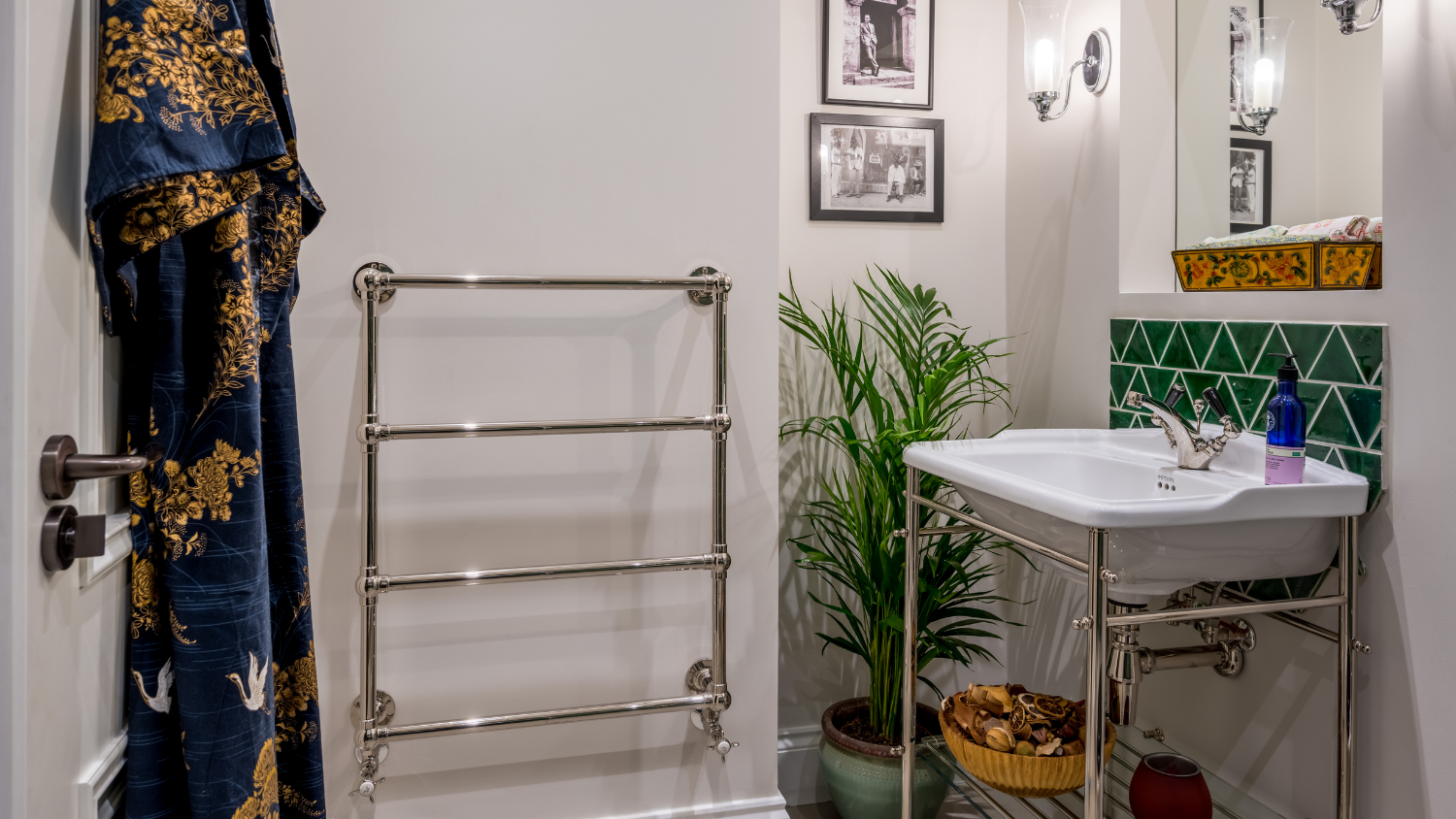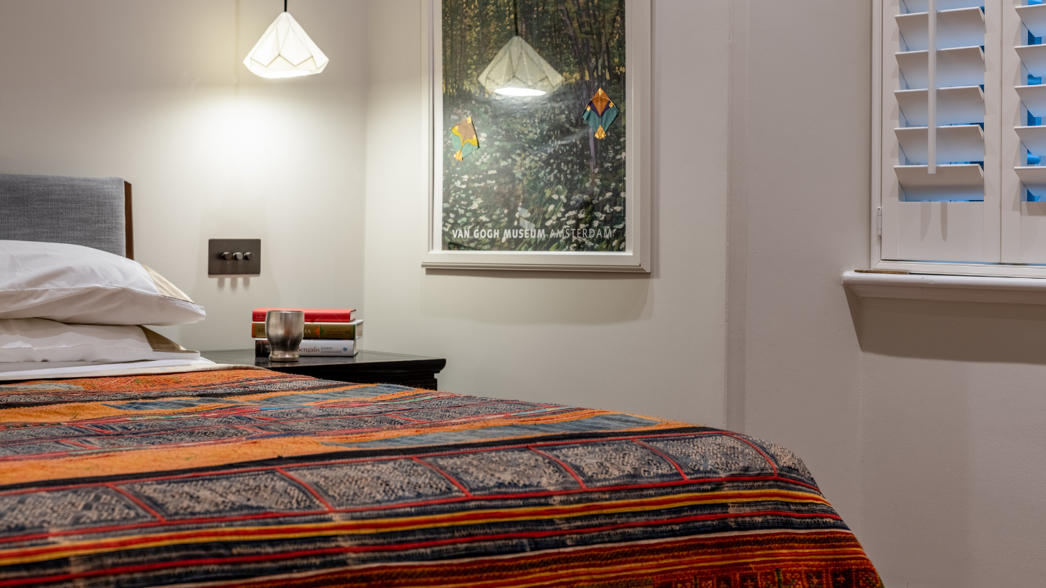 This captivating design effortlessly merges contrasting elements and vibrant shades, creating unique and inviting spaces throughout the home. The previously dark kitchen now feels light and airy with the use of pale colors, and randomly arranged cement tiles for the splashback add visual interest. High ceilings and ample windows enhance the sense of spaciousness.