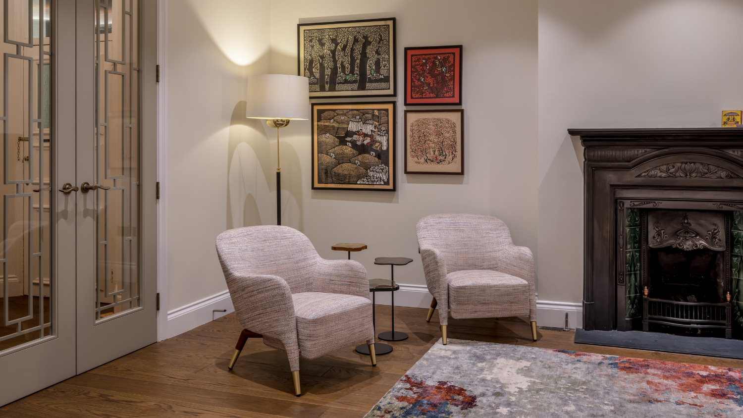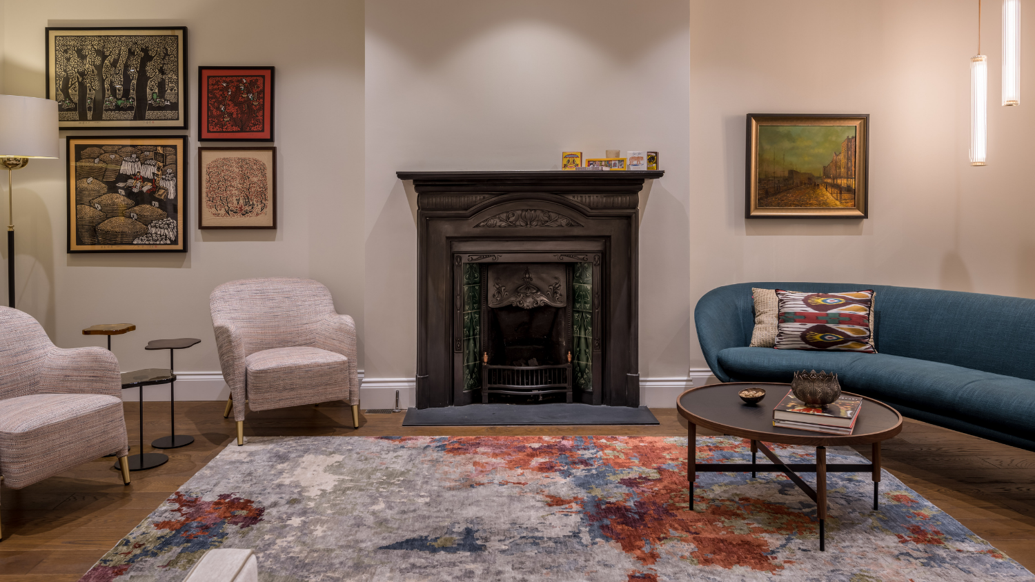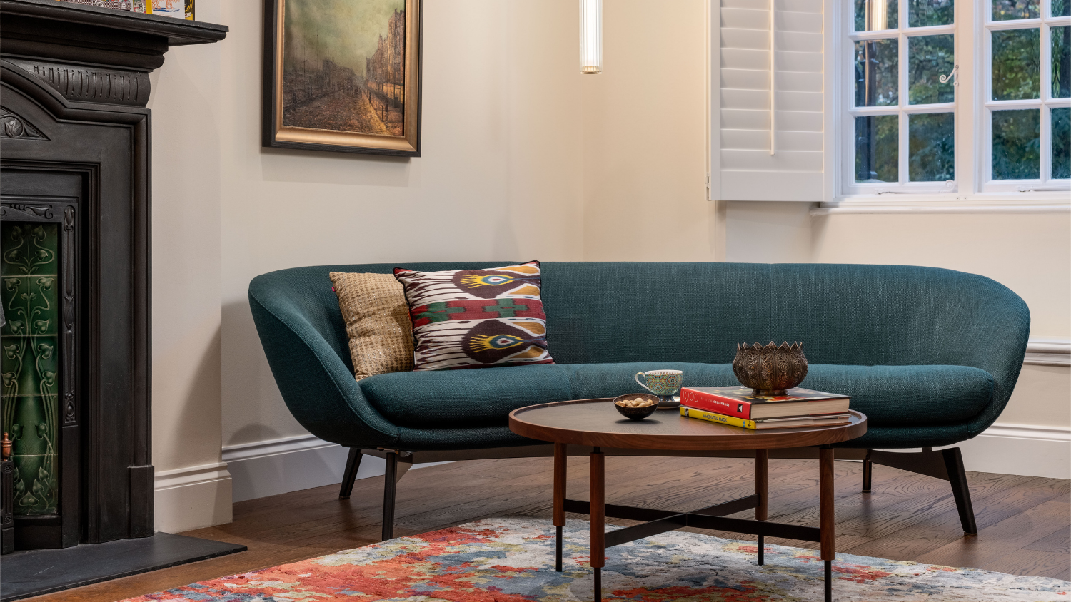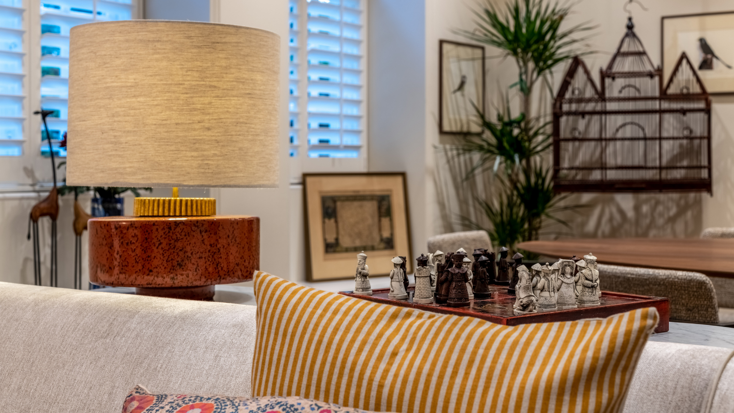 An antique birdcage suspended from the ceiling, with artwork of a bird behind it, adds a whimsical touch. The curved sofa provides comfortable seating and a panoramic view of the room, while a metal and wood coffee table sits in front, accompanied by warm-hued reeded glass suspended lighting.