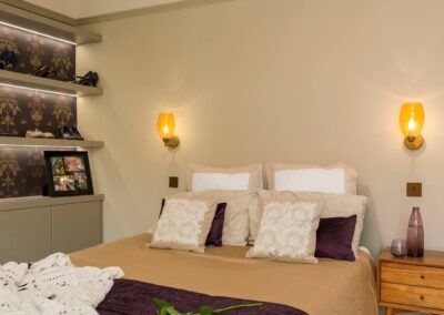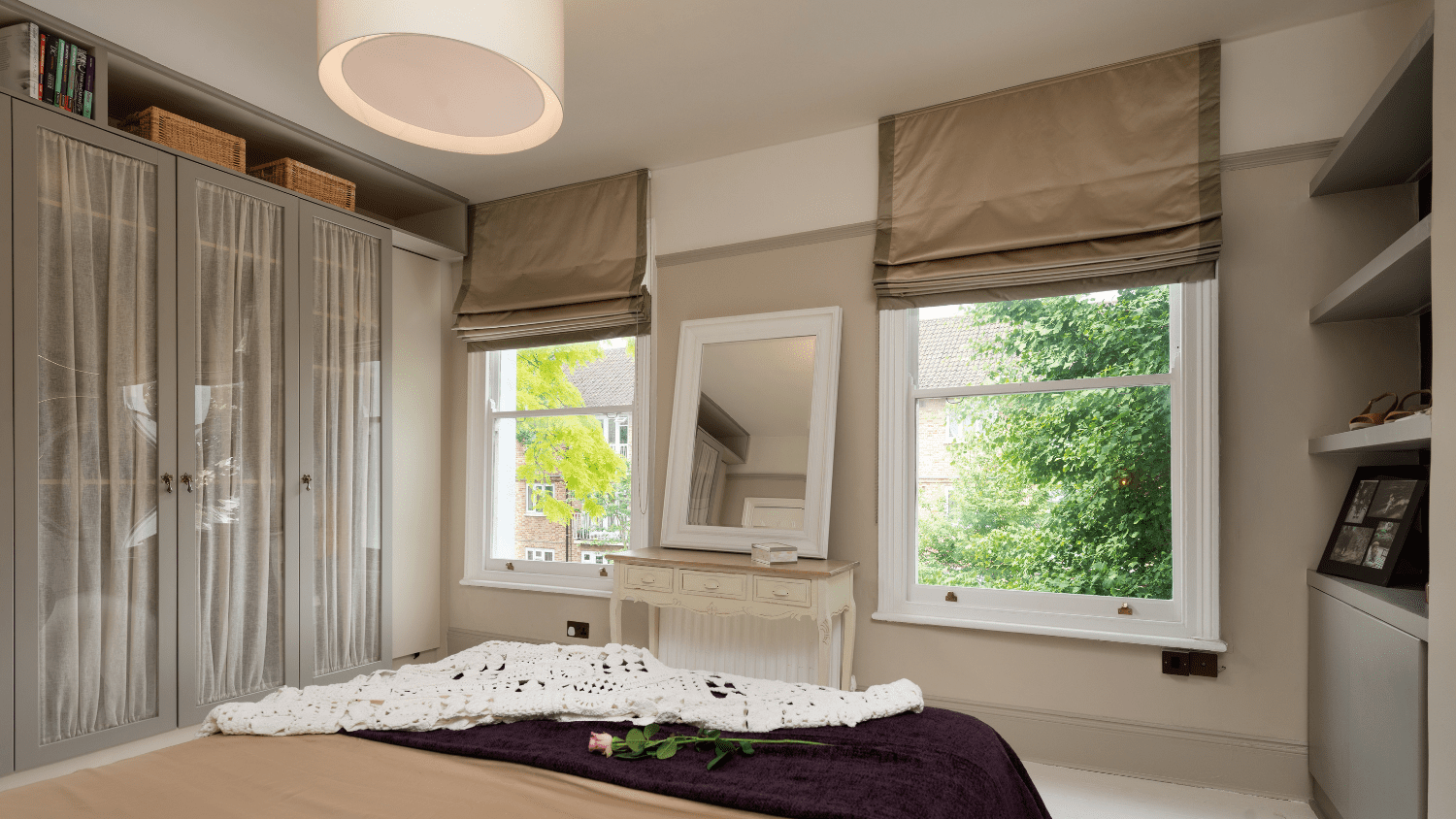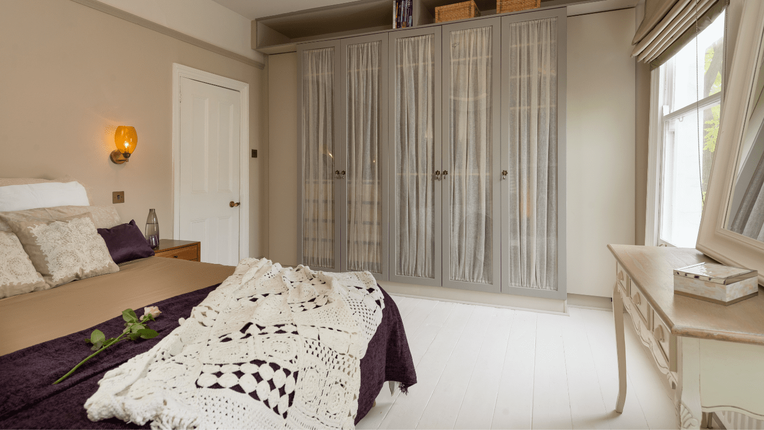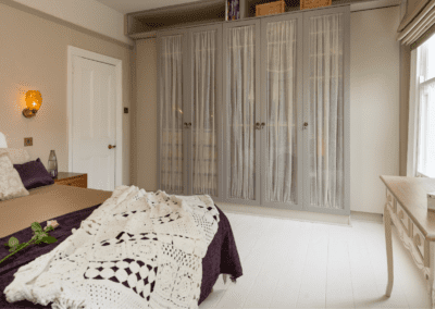 The uncluttered room creates a tranquil haven for the young family, with glass wardrobe doors preserving the airy feel. A delightful blend of rejuvenation and thoughtful design.