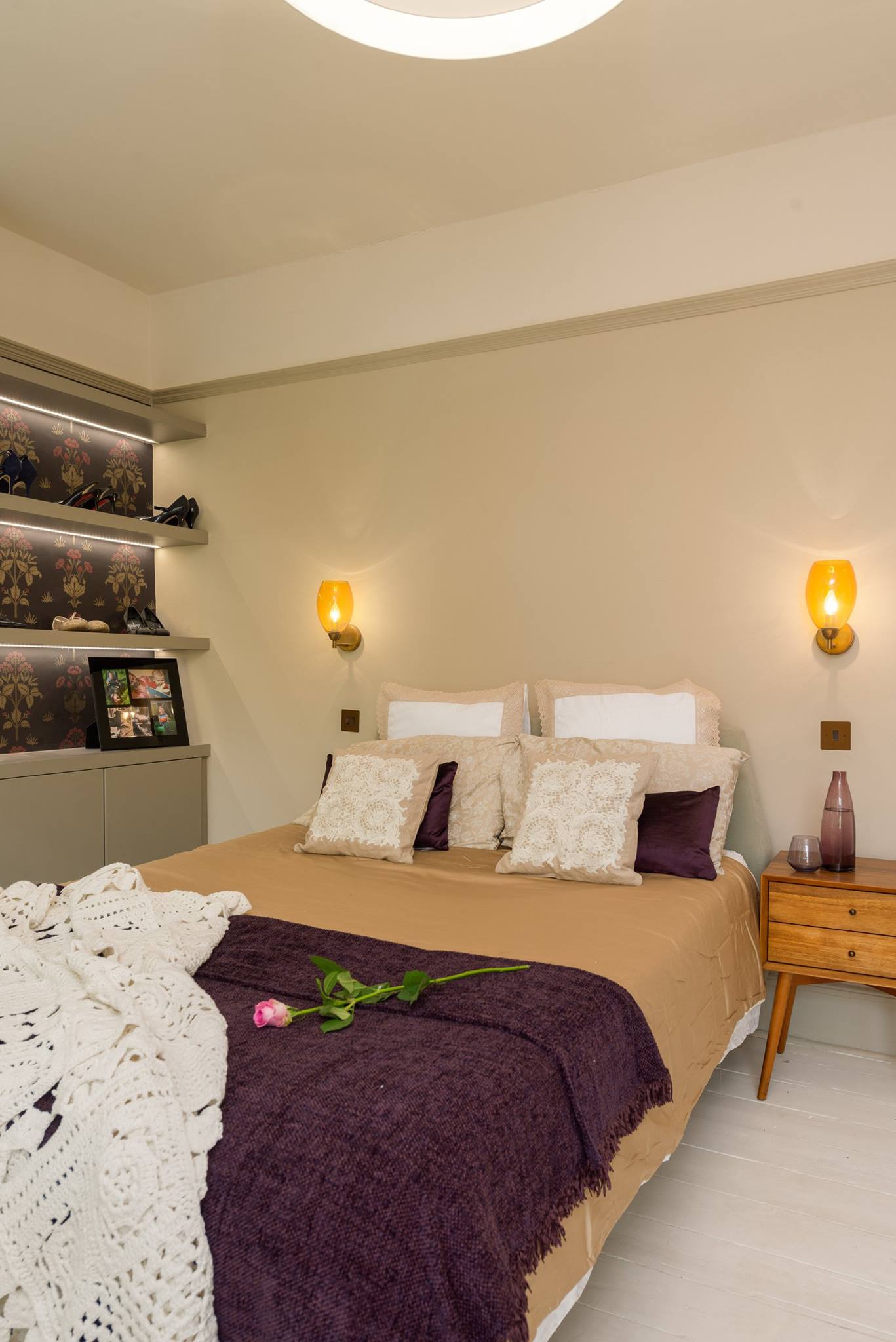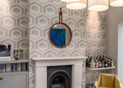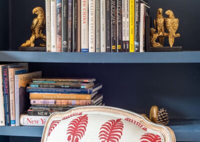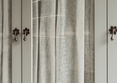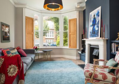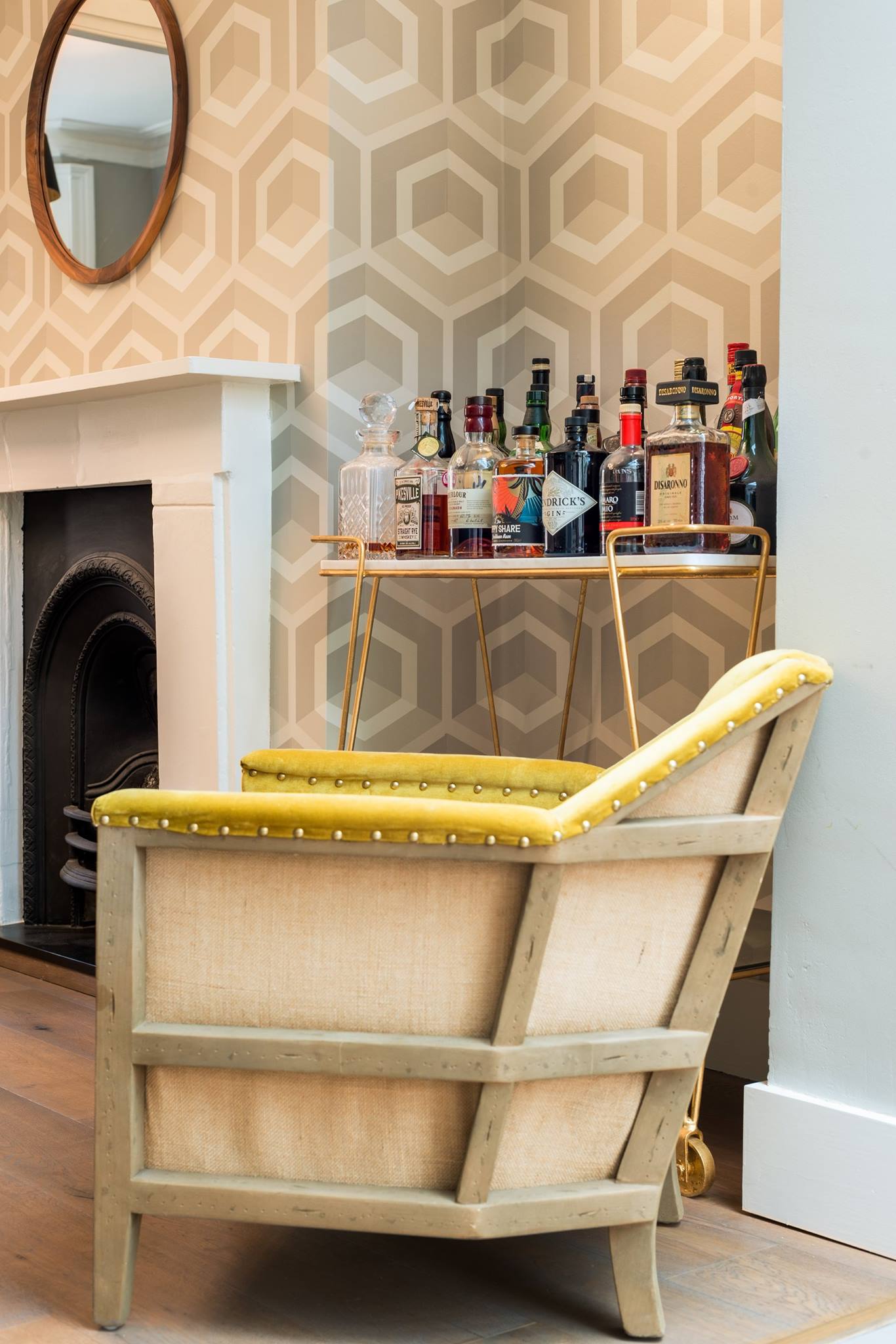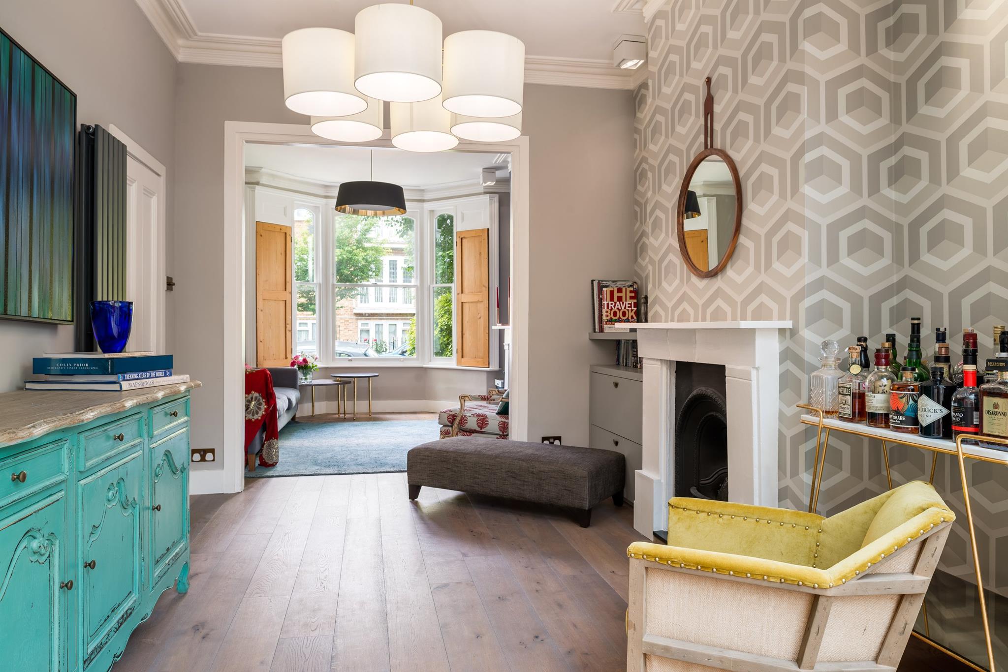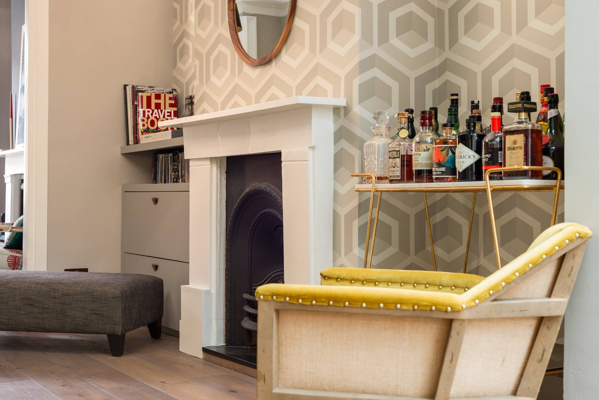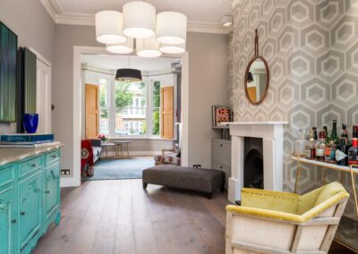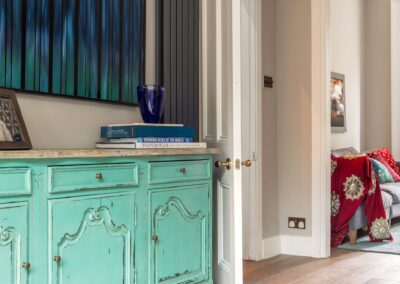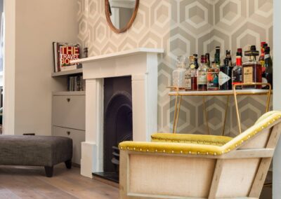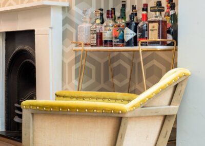 A world that breathes new life into old furniture, with reupholstered linen fabric and a deconstructed armchair in mustard velvet. Simple and light touches, such as linen fabric hung on string for wardrobes, maintain the period aesthetic. Personal touches, like the homeowners’ wedding shoes against Morris wallpaper, add charm.