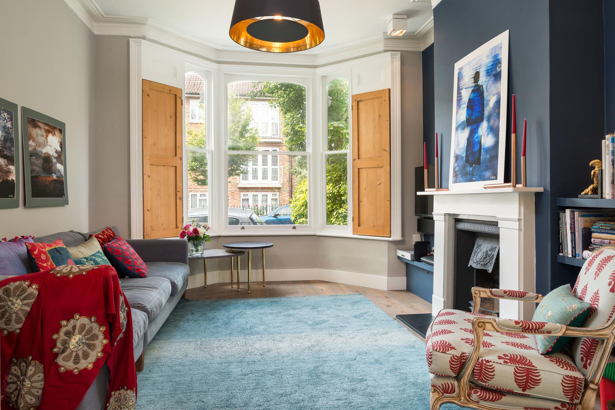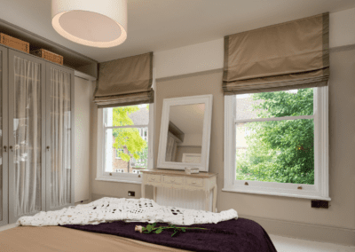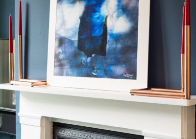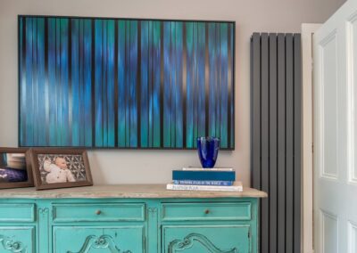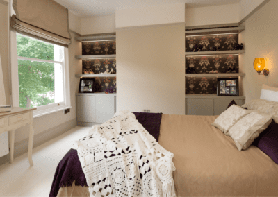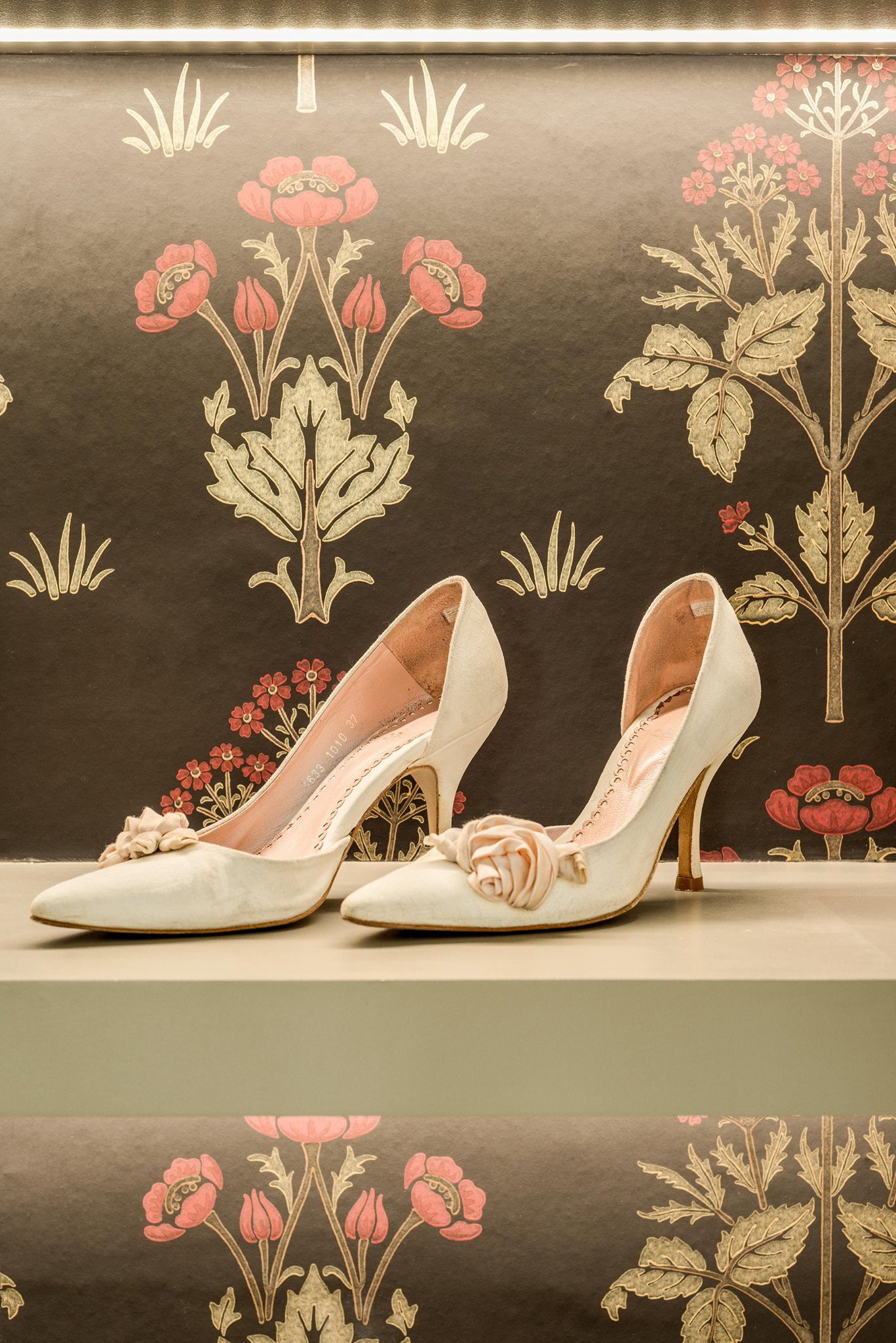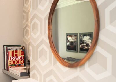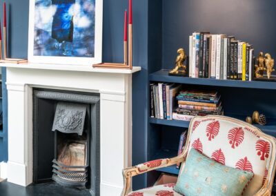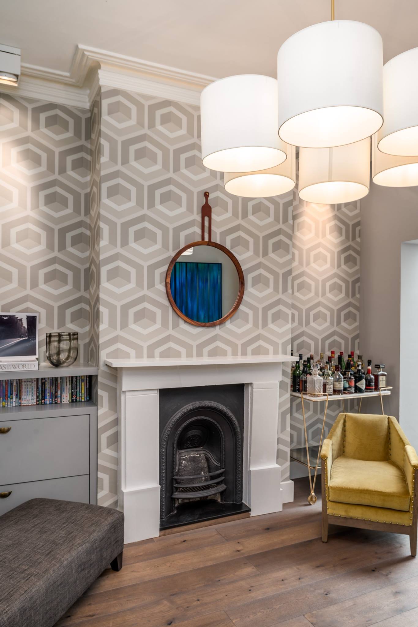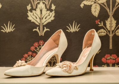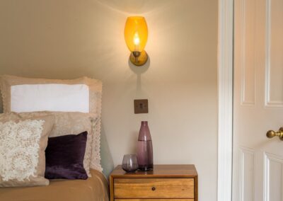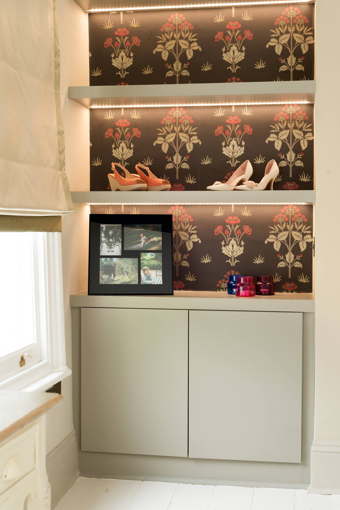 A world that breathes new life into old furniture, with reupholstered linen fabric and a deconstructed armchair in mustard velvet. Simple and light touches, such as linen fabric hung on string for wardrobes, maintain the period aesthetic. Personal touches, like the homeowners’ wedding shoes against Morris wallpaper, add charm.