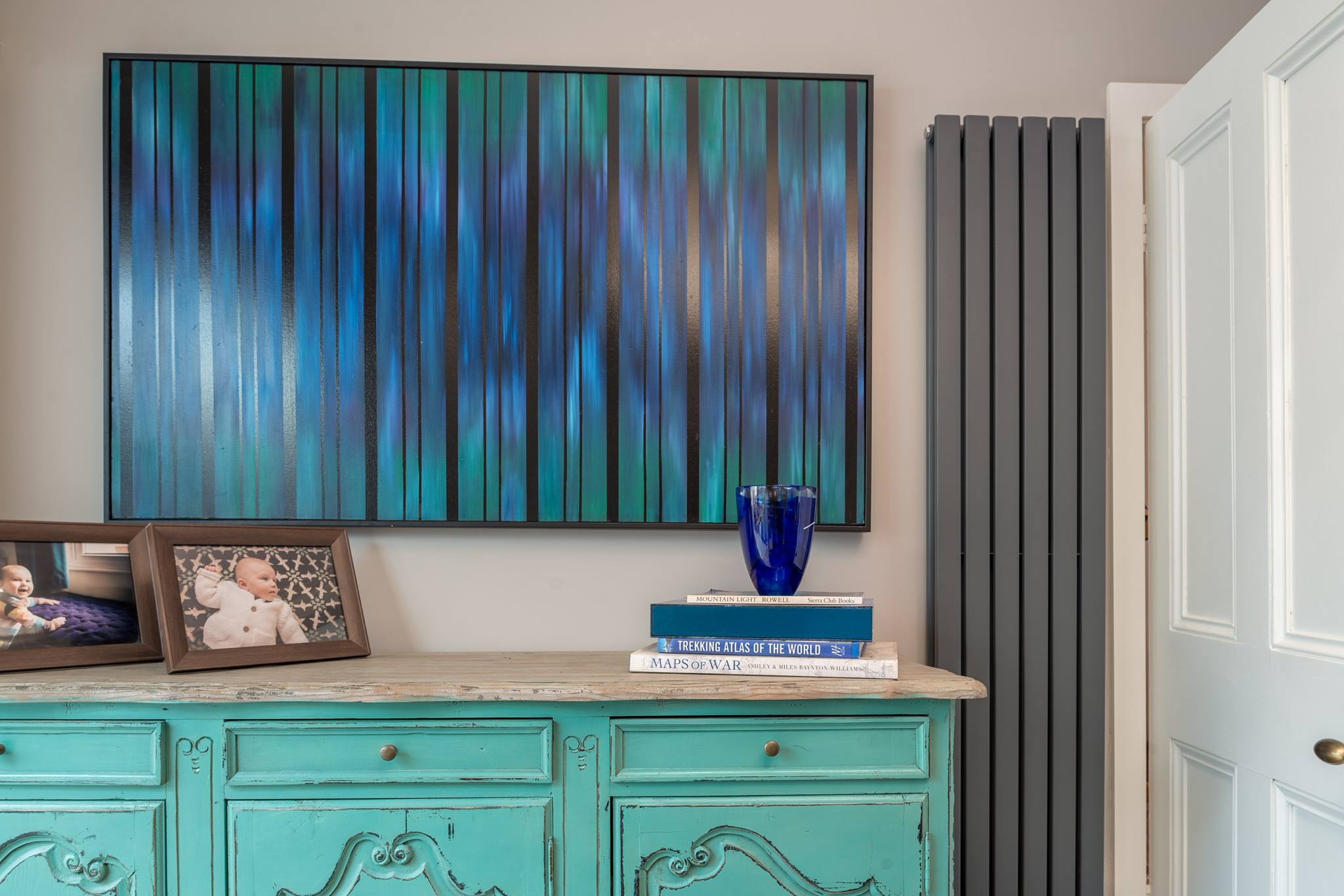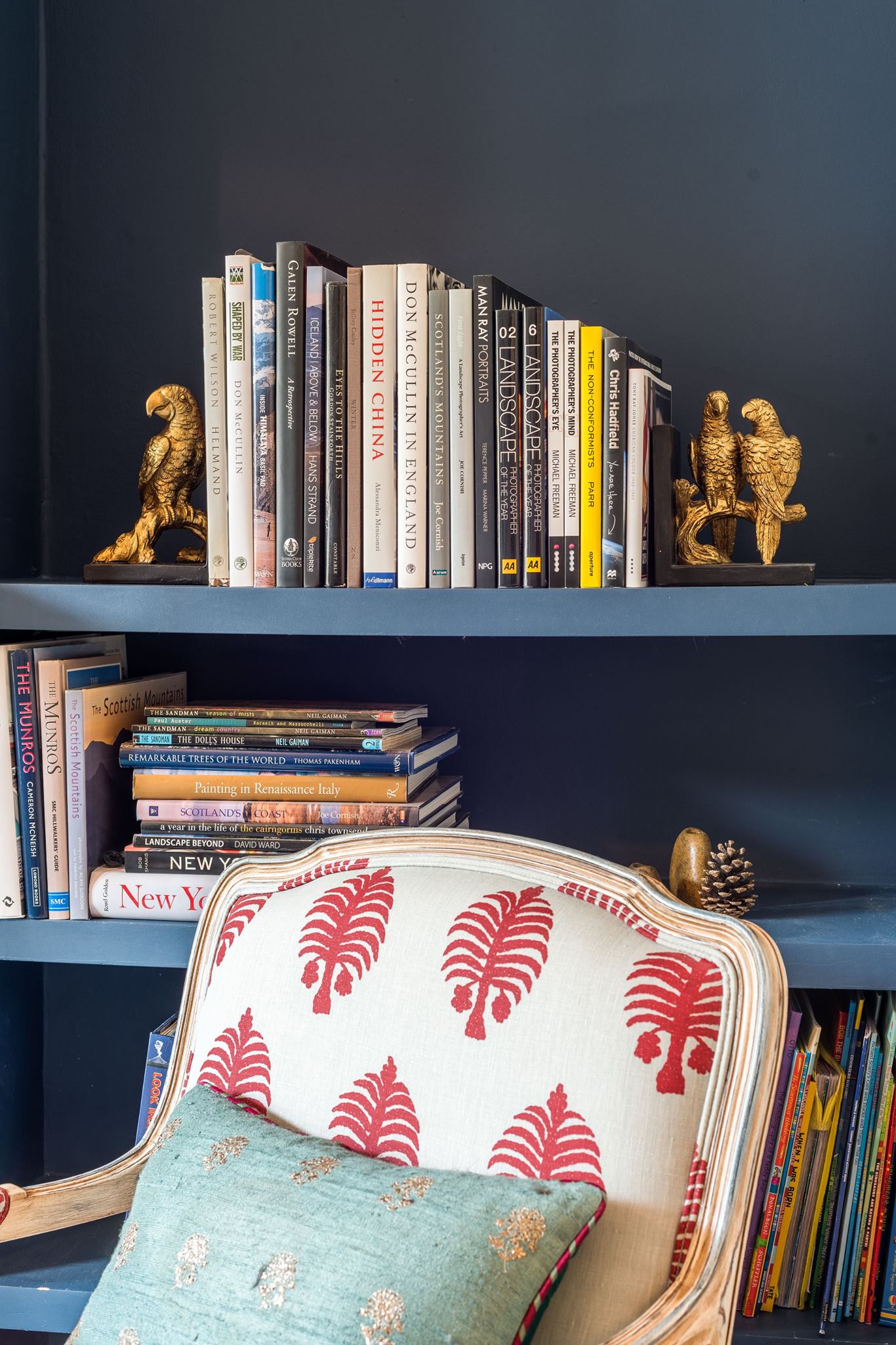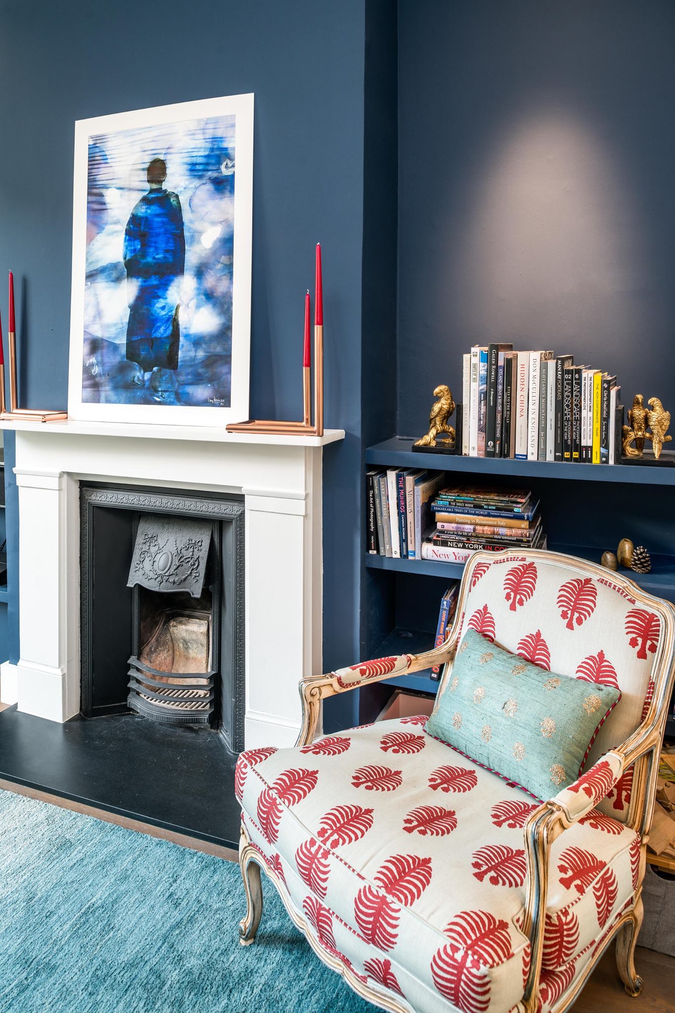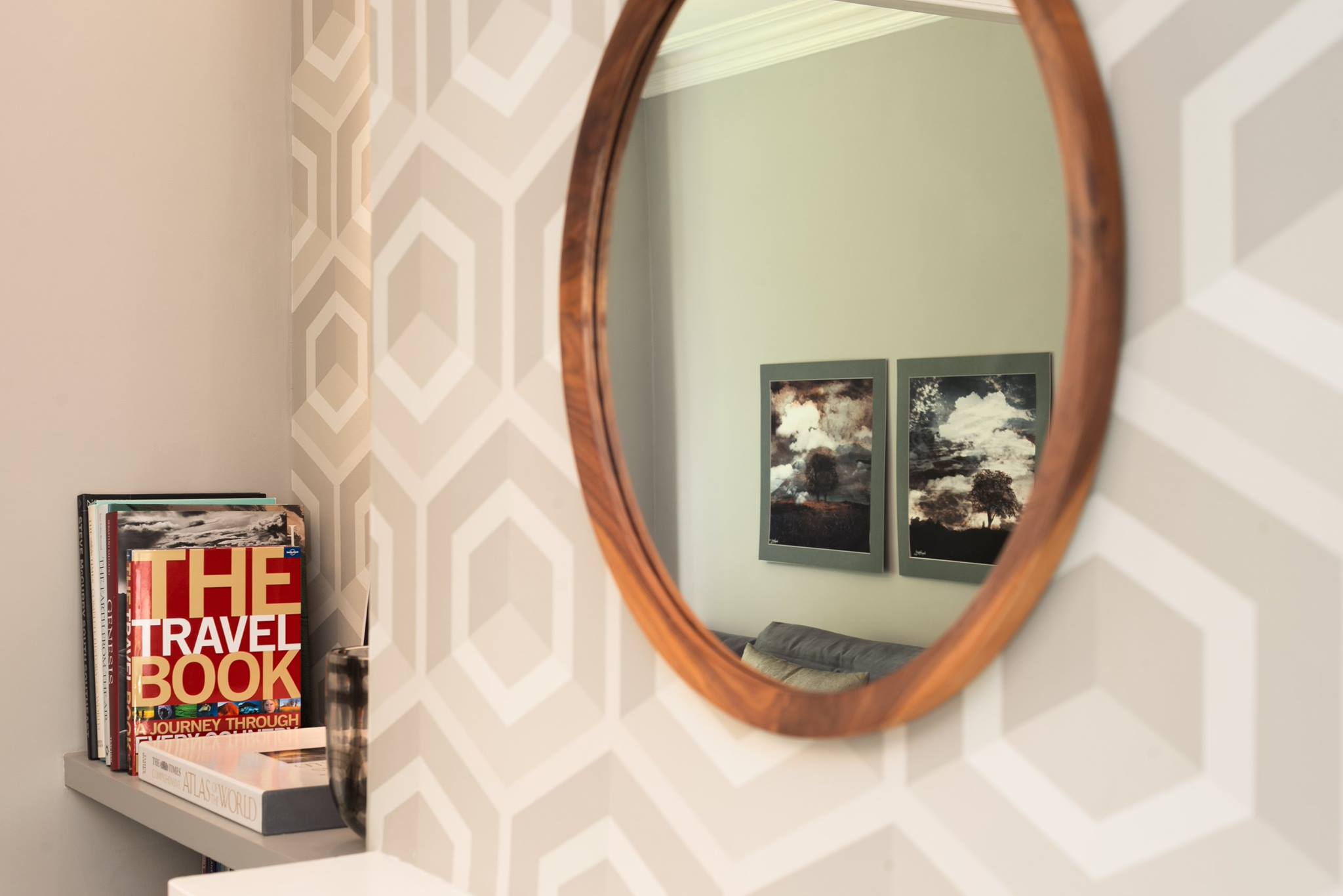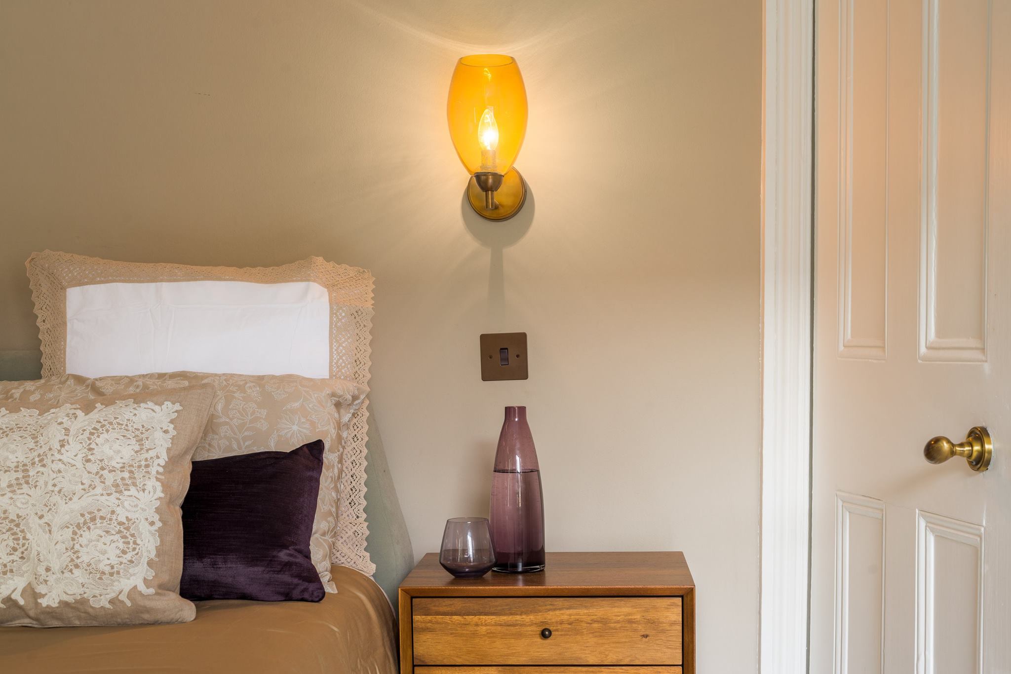 A world that breathes new life into old furniture, with reupholstered linen fabric and a deconstructed armchair in mustard velvet. Simple and light touches, such as linen fabric hung on string for wardrobes, maintain the period aesthetic. Personal touches, like the homeowners’ wedding shoes against Morris wallpaper, add charm.